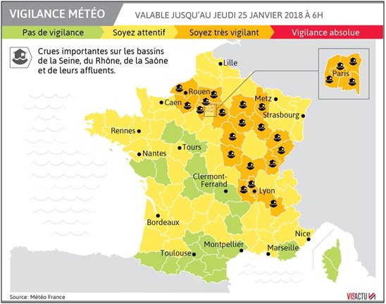 Avec une pluviométrie exceptionnelle et des sols saturés d’eau, pas étonnant que de nombreux cours d’eau aient débordés. Le 24 janvier, le pic de la crue du Doubs et de la Loue étaient atteints à Besançon. Cette onde de crue qui a touché l’ensemble du bassin du Doubs aura des répercussions sur l’aval, sur la Saône notamment, jusqu’à la fin du mois de janvier. Le 25 janvier, 23 départements étaient en vigilance orange inondation avec des crues importantes effectives ou annoncées sur les bassins de la Seine, du Rhône, de la Saône et de leurs affluents.