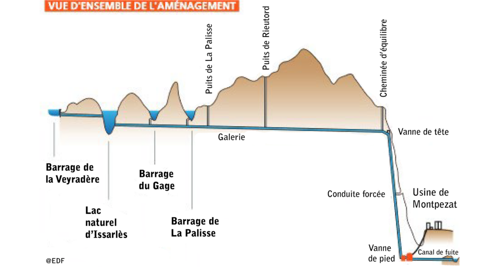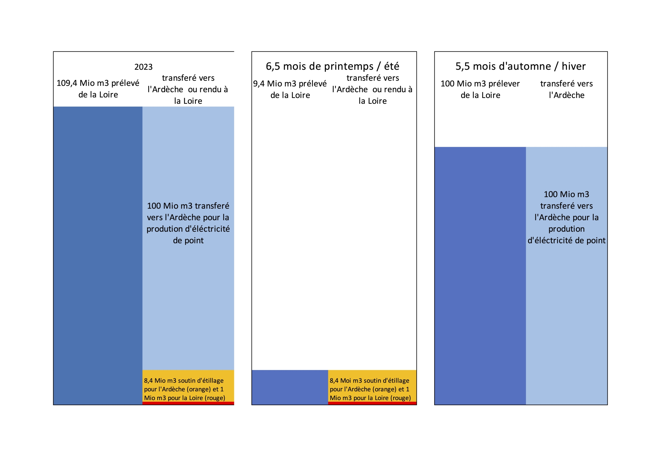 Ainsi en 2023 c’est 108,4 Millions de m3 qui ont été transférés vers l’Ardèche (contre 220 Mio m3 les « meilleures » années). La majeure partie, 100 Moi m3 ont été prélevés à la Loire en automne et transférés en hiver pour la production d’électricité de pointe. La baisse importante des précipitations en automne/hiver observée a eu pour conséquence une baisse du turbinage hivernale de 50 % par rapport au passé.