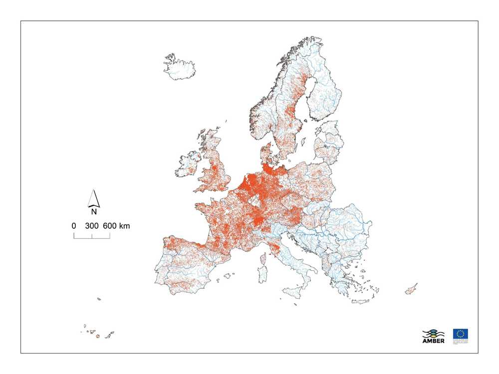 Map from : AMBER, Belletti et al 2020. Nature. 588, 436-441 Pan-European Atlas of Obstacles in Rivers,630,000 obstacles identified and 1 million estimated, of which 100,000 are obsolete or unused, AMBER 2020