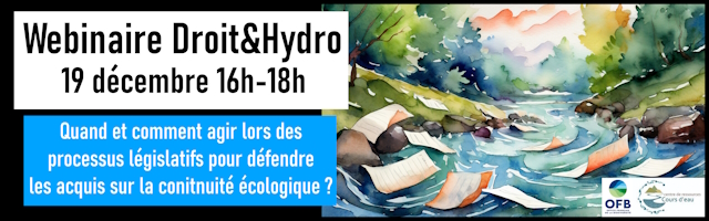 19 December 2023: Law, Hydro & Ecological Continuity, more info and programme here , organised in partnership with Réseau RivièresTV, the Centre de Ressources Cours d’eau and supported by the French Office for Biodiversity (OFB)