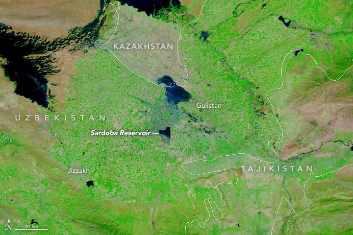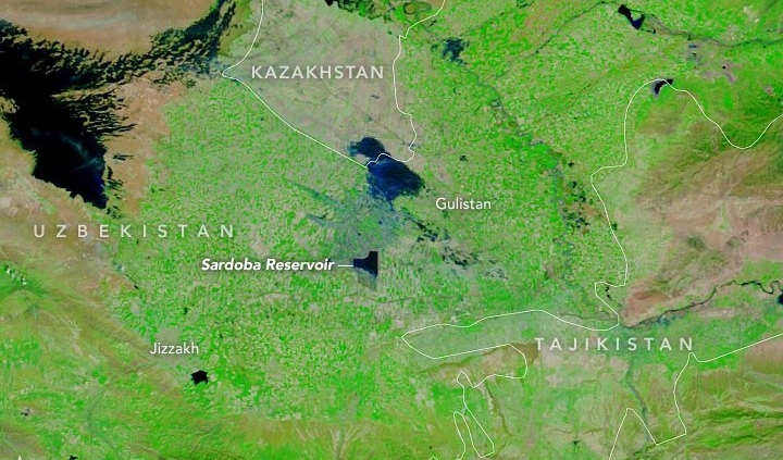 PHOTO / The reservoir on May 8 2020, showing the emptied reservoir and the extent of the flood water across Uzbek-Kazakh border