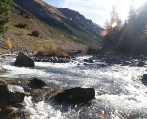 Because of these heavy alterations on the lower part, the selected section (green color on map below) is limited to a section of the Chamuera River from the spring down to the flow datastation (Map below).